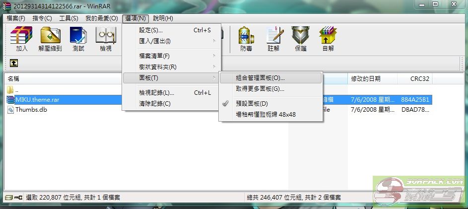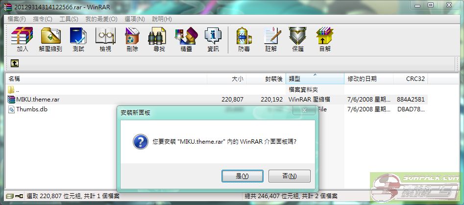 | -- 作者:yiufat -- 发布时间:2012-09-09 1:18:00 -- WINRAR 初音皮肤 使用效果: 壓縮檔內的圖標(左)&顯示壓縮檔的圖標(右) 使用方法: (不用解壓)直接打開,雙擊壓縮檔,選擇"是"[如圖] 成功後,按選項→面板→組合管理面板[如圖] 如果只看到預設面板(左圖),就請按"加入",再按取消 就能看到剛才添加的皮肤了(右圖) 最後選擇剛添加的皮肤,再按"選擇"→"確定"即可 (右圖的亂体文字只屬於我電腦的問題) 下載點:http://sorpack.com/viewFile.asp?BoardID=129&ID=678240 [此贴子已经被作者于2012-10-27 00:55:10编辑过]