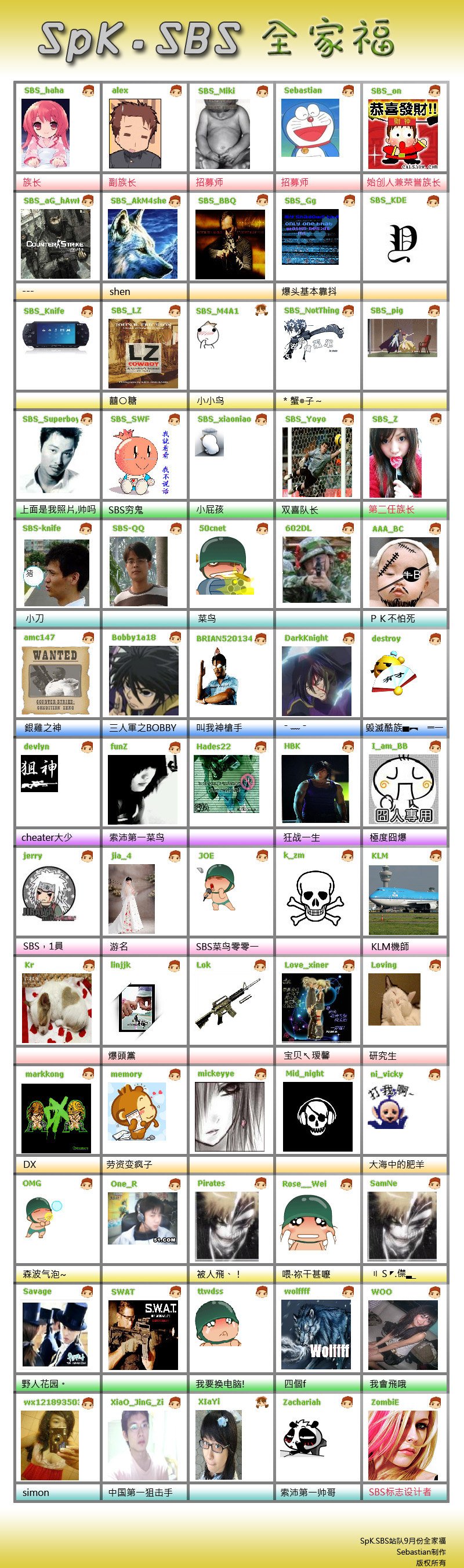 | -- 作者:Sebastian -- 发布时间:2008-09-23 20:27:00 -- SpK.SBS戰隊9月份全家福,歡迎各隊成員參觀 SBS的全新全家福,歡迎各SBS成員及其他隊成員給予意見 你的意見能令我做得更好,謝謝! 由於本次全家福有多達65位有頭像的成員 人數眾多,如有遺漏或錯誤資料,請即通知 多謝你的參觀 SpK.SBS戰隊8月份全家福: http://www.sorpack.com/dispbbs.asp?BoardID=2&replyID=6702&id=36013&skin=0 SpK.SBS戰隊3月份一家親: http://www.sorpack.com/dispbbs.asp?BoardID=2&replyID=5239&id=25091&skin=0 [此贴子已经被作者于2008-9-23 20:29:50编辑过]