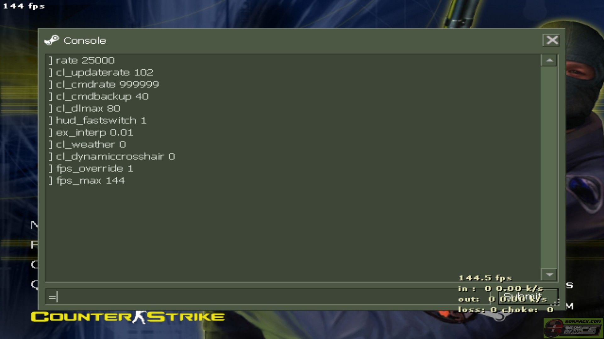 大家可以参考上图,有其他意见可以补充(fps_override 1可以解锁FPS,不会被限制于100或60,再用上fps_max 144(数字是你期望的帧数)