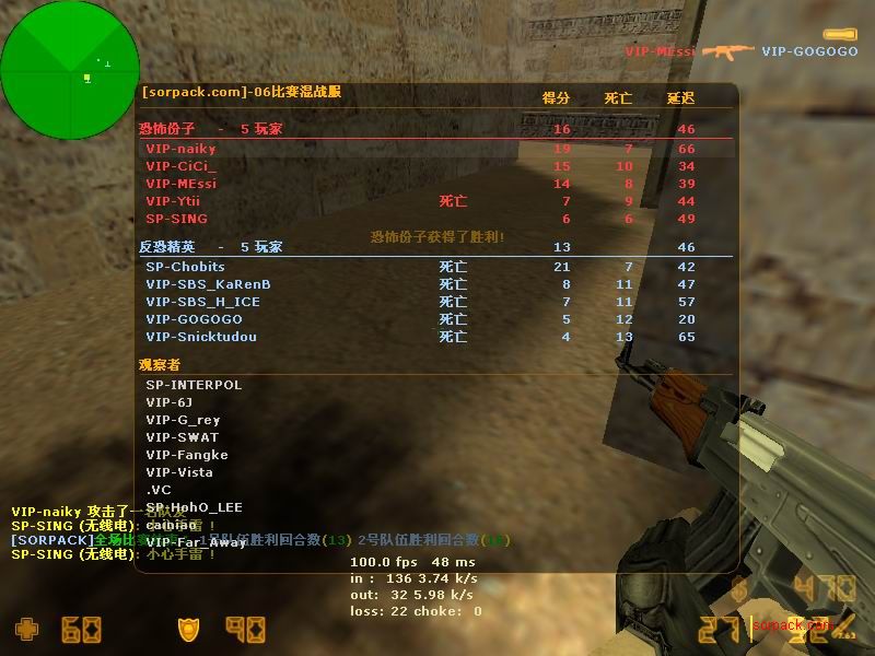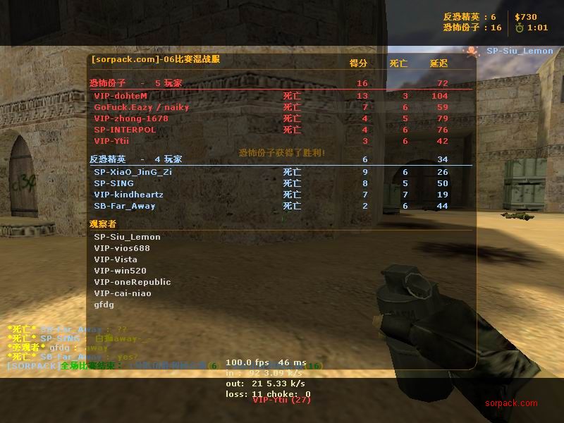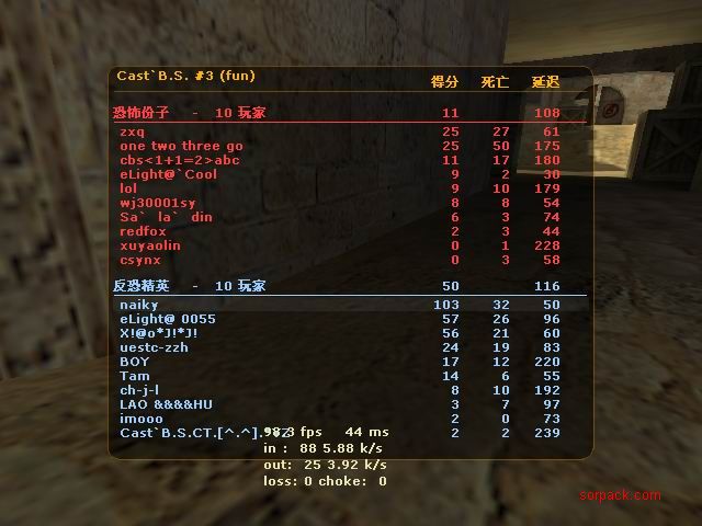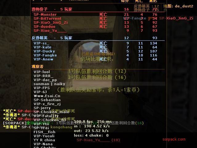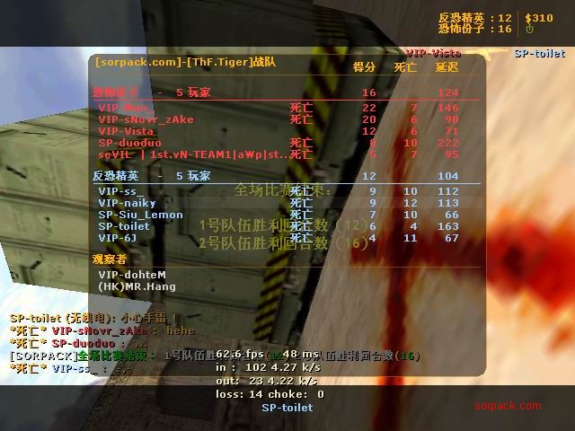 傻怪倒了 哈哈 有lead 也要打~ gof对sbs win! 有人跑了。。。 受不了虐啊 我死的好多 。。 死了14局 我擦。。 又是一场D2 虽然输了 不过有frag可以安慰我 不过要记住 拿frag不是目标 多给队友创造机会 多给队友提供炮弹才是一个好的队员 我希望我能成为输送炮弹 给队友断后的那人 也就是靠山吧 哈哈 (队友,我帮你瞄着,你就放心的转移吧;我当炮灰,你来清了他们。 @_@) 又是连续3张的战绩图 最先死的是我。。 4位SP也登场