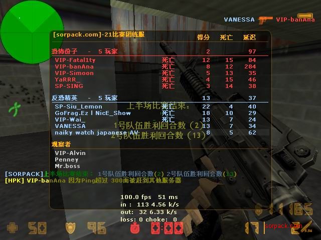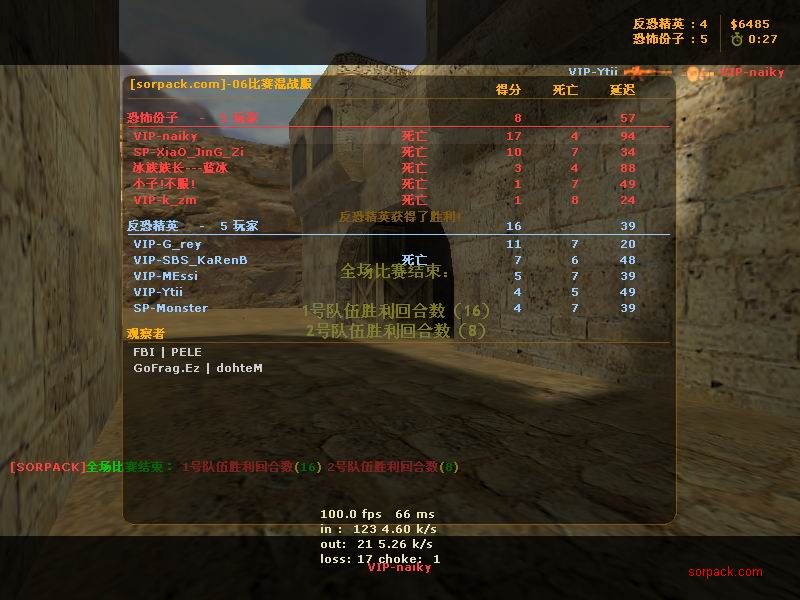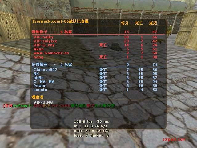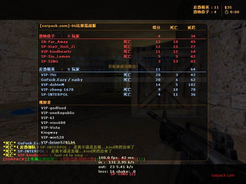 杀了56:8 我还没杀完呢 结果被一帮人投票了。。 看左下角。。投票正在火热举行,我赶紧按住TAB 截一张图。。。 这图应该还在GOF个人战绩榜里 ~ 战胜肥肥的队。 GOFvsXXX 有人说我不会打 “|”。。。 俺是故意打“/”的。。。