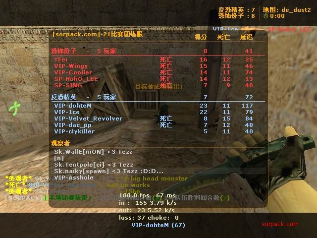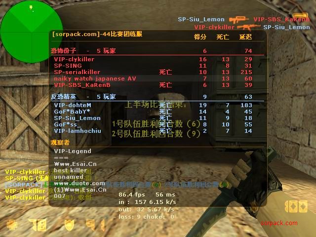 这应该是我被鸭子刀杀的那场比赛。。 我们的B点埋包后的camp实在是太烂了 也没有互相之间的掩护。。 鸭子竟然从狗洞钻进来刀了我 当时真的很无语。。。 =。=!!! messi的枪也蛮厉害的 我对枪很吃力。。 AV男掉线了 赶紧抓一张!! 掏出匕首的瞬间!我在打1.5 ! 左边的人快撑不住了。。
