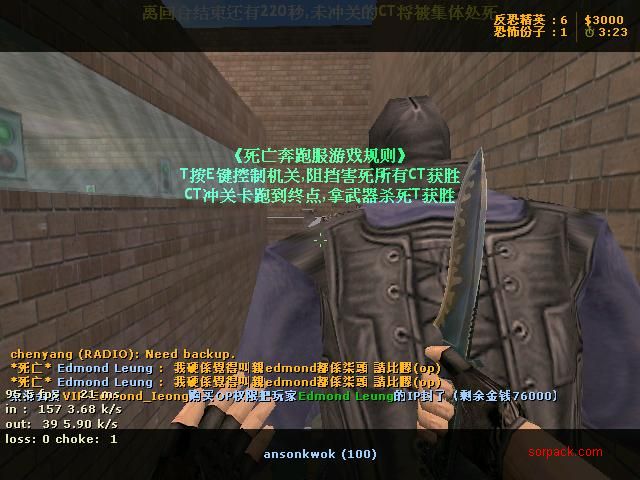以下是引用Rambo在2009-7-23 08:59:00的发言:得罪左人??  第一个我都封过, 扮vip唔洗俾面 条友都傻傻地= = 我做T(机关者) 佢去到终点~ 要杀我~~~我就狂走= =~ 打到佢得番30HP左右。。佢话 系咪都死 走乜捻 我都觉得冇乜问题= =~ 吾知佢点解要嘈~佢一直讲 我都冇讲野0.0 一直影相