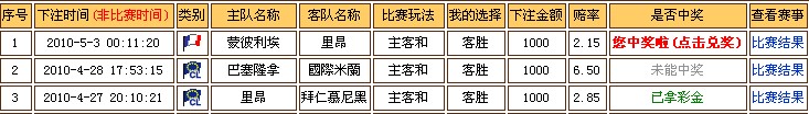 以下是引用xiaoshazibenben在2010-5-3 08:56:00的发言:| 1 | 2010-5-2 23:05:24 |  | 奧柏侯遜 | 杜塞爾多夫 | 波胆(比分) | 2:1 | 243 | 9.50 | 未能中奖 | 比赛结果 |