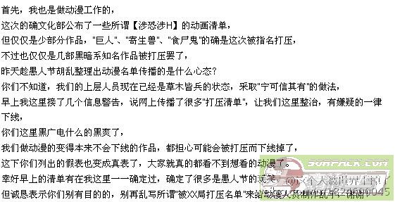 | -- 作者:Love_vae__ -- 发布时间:2015-04-03 18:00:00 -- 对于广电的误会,我在这说声对不起 http://sorpack.com/dispbbs.asp?boardID=32&ID=2214830&page=1 对于广电的误会,我在这说声对不起 是文化部干的好事!!! 名单是假的 对于广电的误会,我在这说声对不起!!