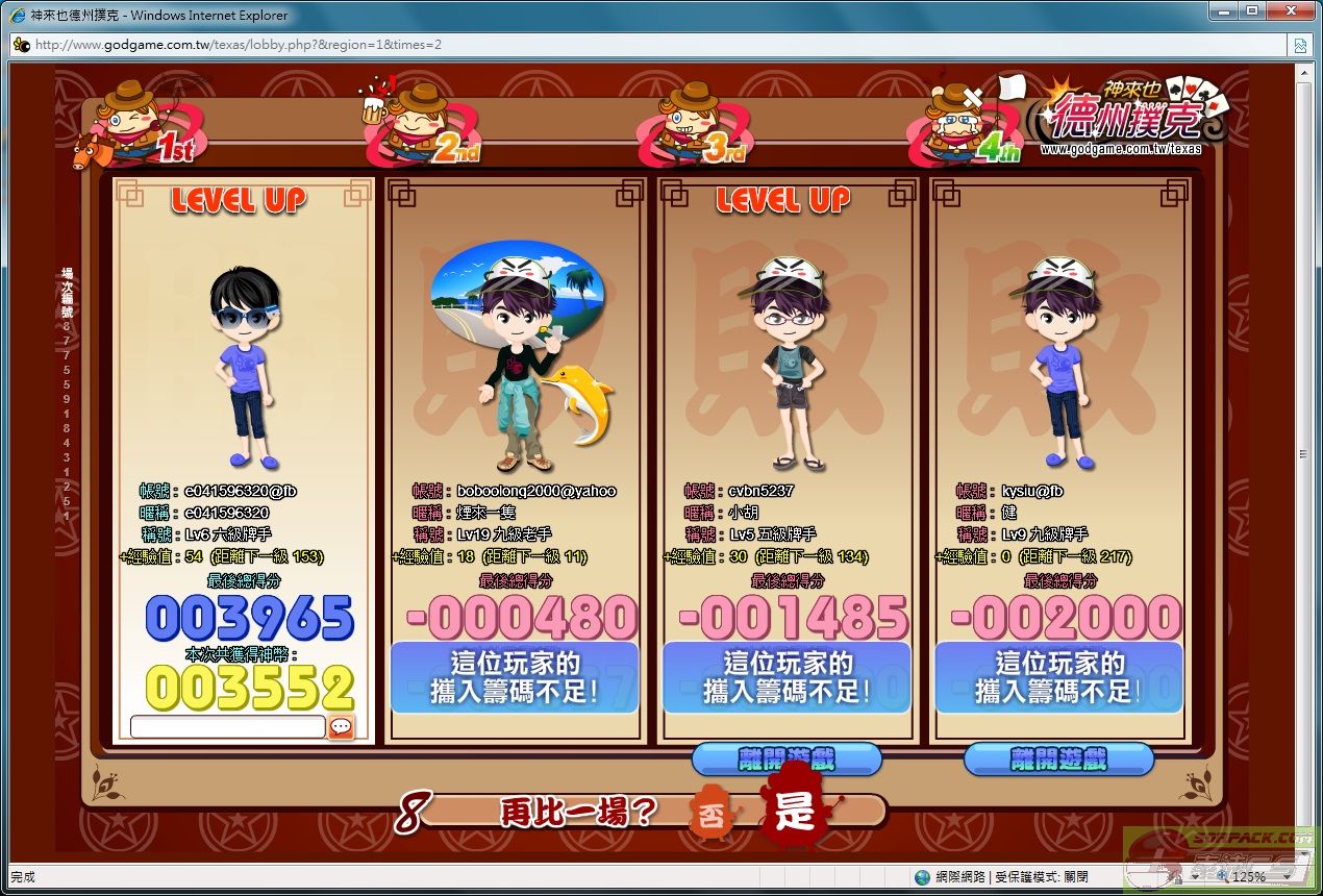 | -- 作者:tony22807803 -- 发布时间:2010-10-11 12:59:00 -- 太棒了~~MM也快樂 MM你玩老虎基 營不少 我完神來也剛剛也贏不少ˋ呢~ 不過老虎基輸了60幾+_+ 注意看 500一場的 哥可是贏了全部人 每個人得分都負1000了 少一點的是贏了些 只是說 太慢截圖~~ 捏哈哈!!! 資產增加好多拉~~~