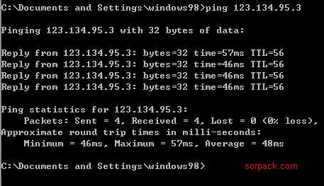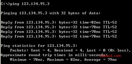 C:\\Documents and Settings\\Administrator>ping 123.134.95.3 Pinging 123.134.95.3 with 32 bytes of data: Reply from 123.134.95.3: bytes=32 time=84ms TTL=53 Reply from 123.134.95.3: bytes=32 time=80ms TTL=53 Reply from 123.134.95.3: bytes=32 time=79ms TTL=53 Reply from 123.134.95.3: bytes=32 time=89ms TTL=53 Ping statistics for 123.134.95.3: Packets: Sent = 4, Received = 4, Lost = 0 (0% loss), Approximate round trip times in milli-seconds: Minimum = 79ms, Maximum = 89ms, Average = 83ms 如上文所示,我的报告如下: 我的网络环境是:广西(北海)电信1M ADSL 平均ping的速度为:79MS