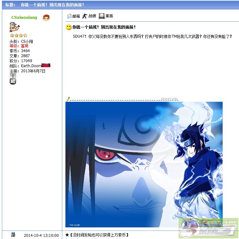 | 以文本方式查看主题 - 索沛CS1.6论坛 CS反作弊 CS1.6下载 amxx sma插件 cs对战平台 (http://sorpack.com/index.asp) -- 投诉举报 (http://sorpack.com/list.asp?boardid=39) ---- 爆粗加辱骂战队…… (http://sorpack.com/dispbbs.asp?boardid=39&id=2141236) |