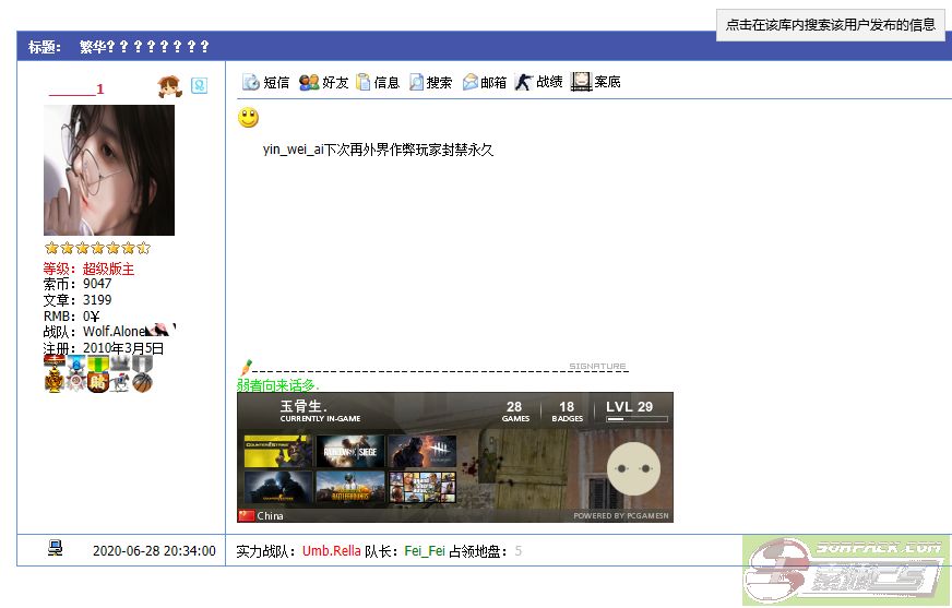 | 以文本方式查看主题 - 索沛CS1.6论坛 CS反作弊 CS1.6下载 amxx sma插件 cs对战平台 (http://sorpack.com/index.asp) -- 投诉举报 (http://sorpack.com/list.asp?boardid=39) ---- 二次外借账号给作弊玩家. (http://sorpack.com/dispbbs.asp?boardid=39&id=2576367) |