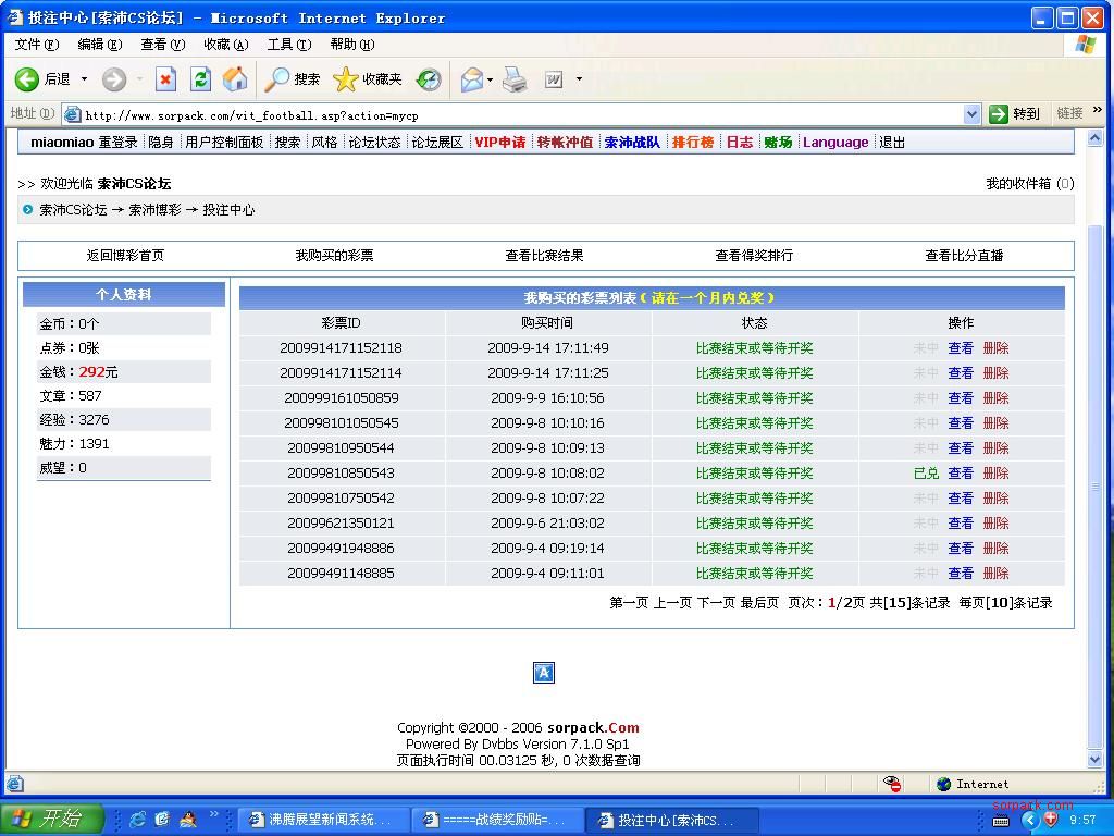 | -- 作者:baobei1107 -- 发布时间:2009-09-16 10:39:00 -- 我还好买了5中了2场,,小亏了点,,不过还可以继续,,呵呵