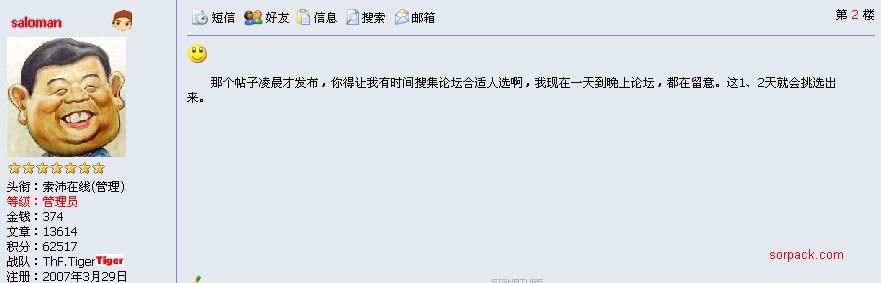 | -- 作者:yinjihuon -- 发布时间:2009-07-31 18:24:00 -- 这1、2天就会挑选出部分SP 这1、2天就会挑选出部分SP,,老大会物色出来部分SP,所以竞争估计也不会那么激烈 此主题相关图片如下:![]() http://www.sorpack.com/dispbbs.asp?boardID=41&ID=101027&page=1 [此贴子已经被作者于2009-7-31 18:25:09编辑过]
