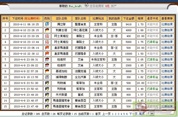 | -- 作者:Mas_AvaNt -- 发布时间:2010-04-11 14:28:00 -- 【By.Av】本人宣布破产……希望大家可以祝福我开心的离开…… 不怪DJ你,昨天跟了你一场反而还赢了点,呵呵…… 也许自己运气本身就到极限了。 是自己眼睛瞎,乱下注的结果。 这是这三天之间的下注情况,可能自己太过求急了。到头来,还是输成一场空……呵呵