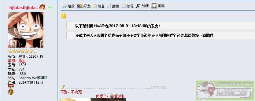| -- 作者:hjkdasfhjkdas -- 发布时间:2017-08-01 19:33:00 -- 以下是引用Oo116oO在2017-08-01 19:30:00的发言: 来,打一个我看看 有你事吗瞎逼逼,我就奇了怪了怎么每天就是你们这些没眼力见的人呢?还要让我怎么退,我退一步他就得寸进尺,还想怎么的啊