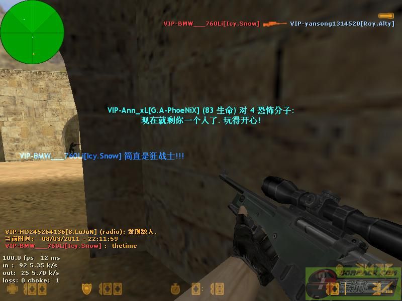 | -- 作者:BMW___760Li -- 发布时间:2011-08-03 22:36:00 -- [原创]菜B战绩,差不多你懂得 一向以菜鸟为名的我还是第一次打这样的成绩 有2把按包结果CT全挂了,6分没了 最后几分钟太想打40分!结果冲太快没杀到 唉!你懂得 |