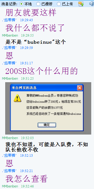 相反,我还自掏腰包,转给bubeinue200SB,让他有钱交入队费。