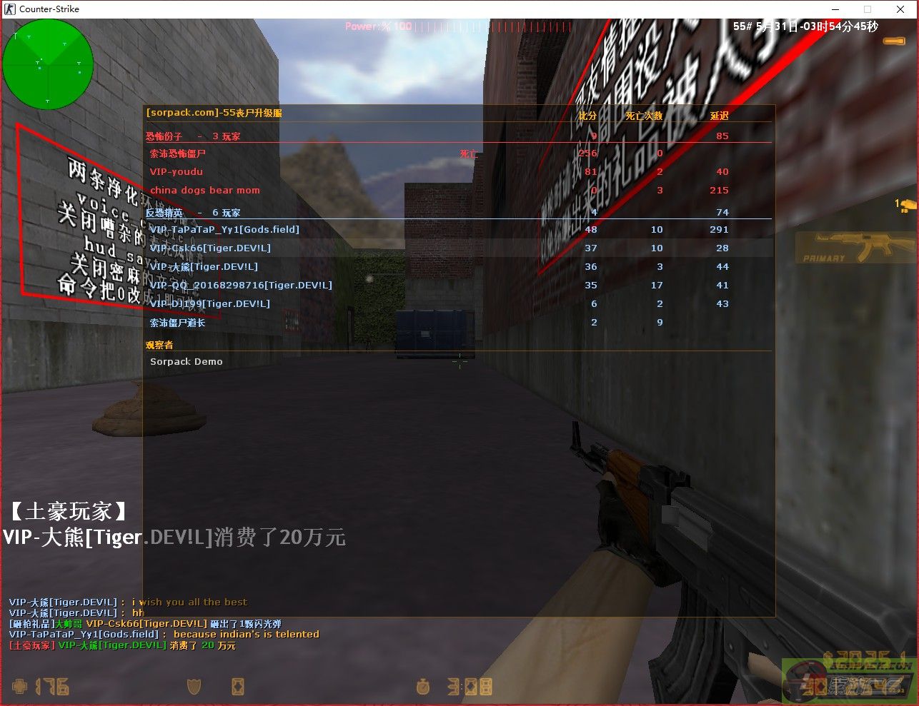 | 2 | 2021-05-31 3:37:00 | 【55丧尸升级服】会员VIP-大熊[Tiger.DEV!L]购买OP权限把玩家VIP-TaPaTaP_Yy1的臭嘴封住了[Demo] |