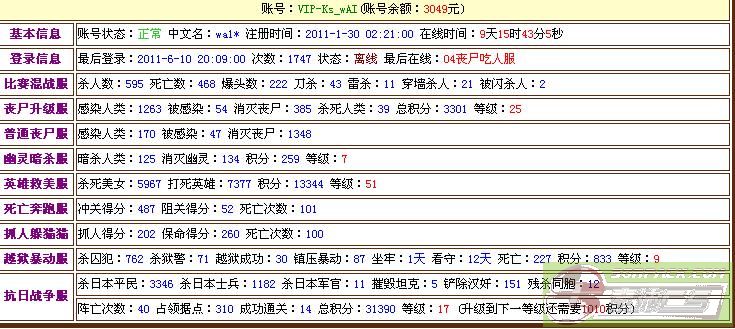 | 丧尸升级服 | 感染人类:1619 被感染:670 消灭丧尸:3442 杀死人类:326 总积分:7108 等级:37 |