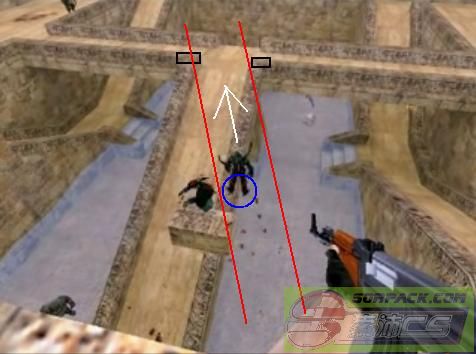 所以要斜着打,尽量保持你的方向,调整在两条红色平行线的范围之内,接着瞄准草泥马的腿部崩一枪