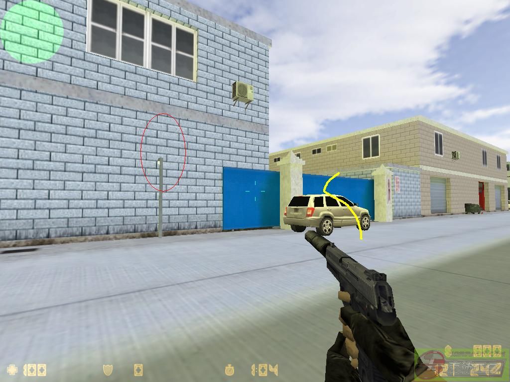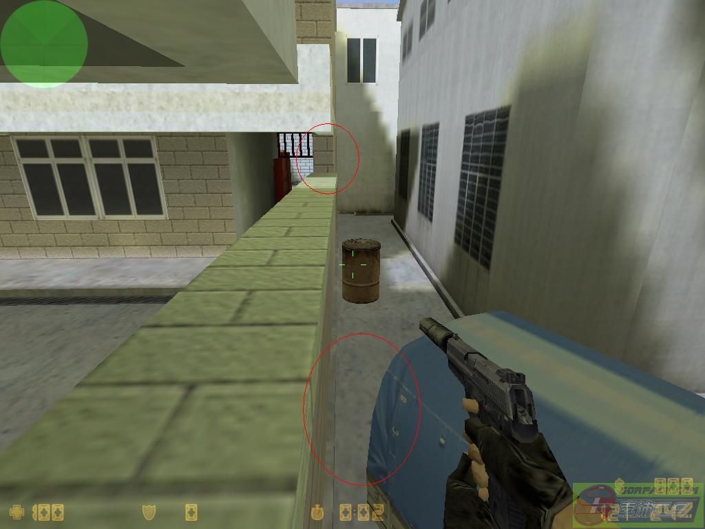 这里可以靠旁边的车子上去,适合小物品,红圈的地方是路牌躲藏的好地方,如果你变成了路牌,躲这里***不留意就不会发现你