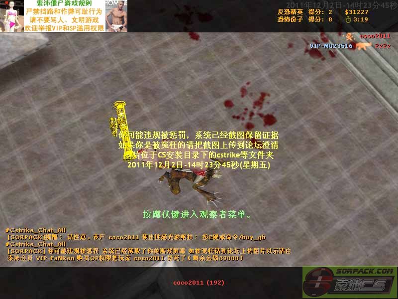 【55丧尸升级服(Tiger.DEV!L)】会员VIP-FaNRen购买OP权限把玩家coco2011处死了