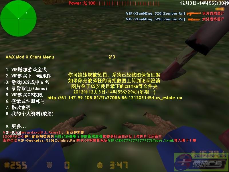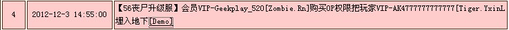 | 10 | 2012-12-3 14:55:00 | 【56丧尸升级服】会员VIP-Geekplay_520[Zombie.Rn]购买OP权限把玩家VIP-AK4777777777777[Tiger.YxinL埋入地下[Demo] |
