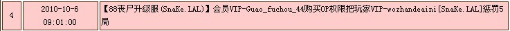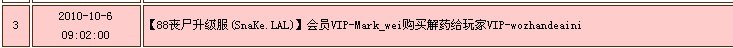142010-10-6 09:02:00【88丧尸升级服(SnaKe.LAL)】会员VIP-Mark_wei购买解药给玩家VIP-wozhandeaini