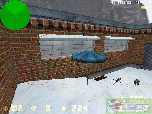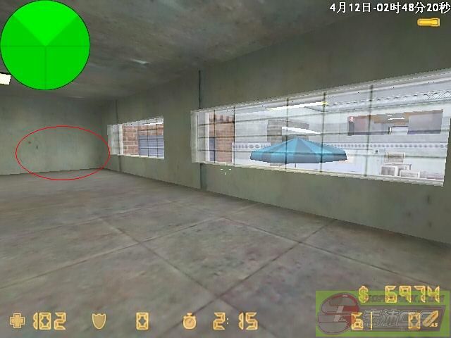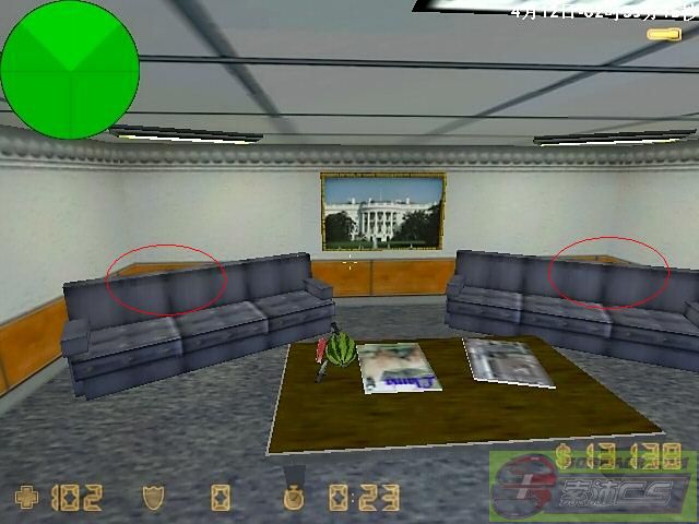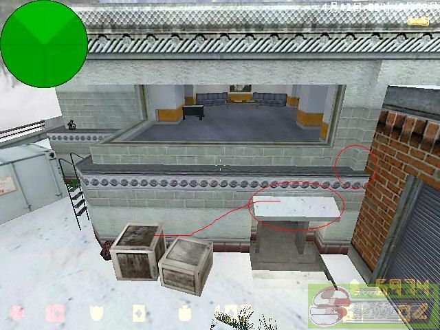 箭头所指的地方一般都有一个物品 草之类的(我的队友手贱把他打掉了) 踩上去后用烟雾弹破开玻璃(如果资金足够用闪光弹! 因为烟雾弹持续时间久 不要为了节约3000而浪费自己一条命!)一般可以躲过2~3次左右的搜查 但是要多看 有人来了马上跑 眼疾手快才能活命 接下来便是CT家了 CT家藏点有2个 如果你成功绕过了第一次搜查 请躲这里: