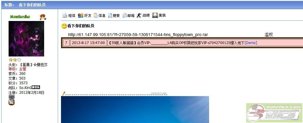 | -- 作者:Tbdy -- 发布时间:2013-08-17 17:36:00 -- so.king的。我不多说什么、看内容 地址:http://www.sorpack.com/dispbbs.asp?boardID=32&ID=1819042&page=1 你们战队的ManBasha 我不知道是谁,但是,s70他不是你们战队的,就请别管,而且,就算你们要管,你们也管不着 s70透视惯犯谁都知道。人人得而诛之,以前在别的战队攻我们KZ的地盘,都是带着透视来 有技术还带透视?这叫技术吗?你们虽然是个游击队,但是你们so.king也是挺出名的,我也听说过 但是用不着为了个作弊惯犯来KZ发帖吧?你要是觉得他没开,直接投诉区,不需要去我们KZ板块 话不多说,作弊狗见多了,没见过这么贱的、有技术了还要开作弊器,玩个游戏有意思? |
